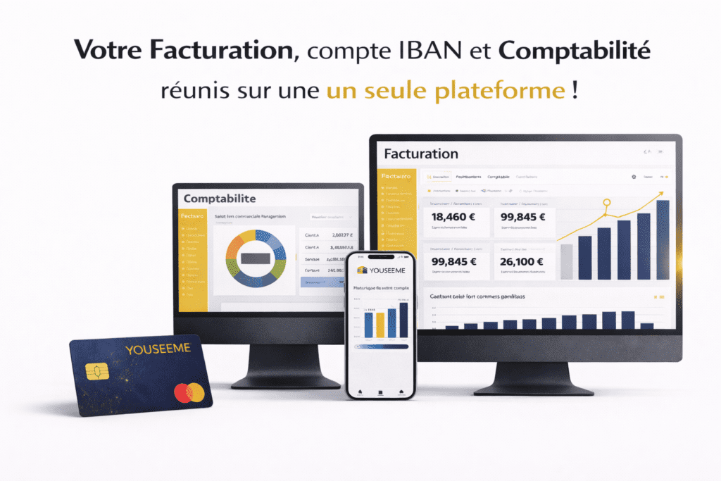 Un compte IBAN, une solution de paiement pour votre site web et vos factures, un logiciel de facturation X et de comptabilité, 1 H.T. par mois